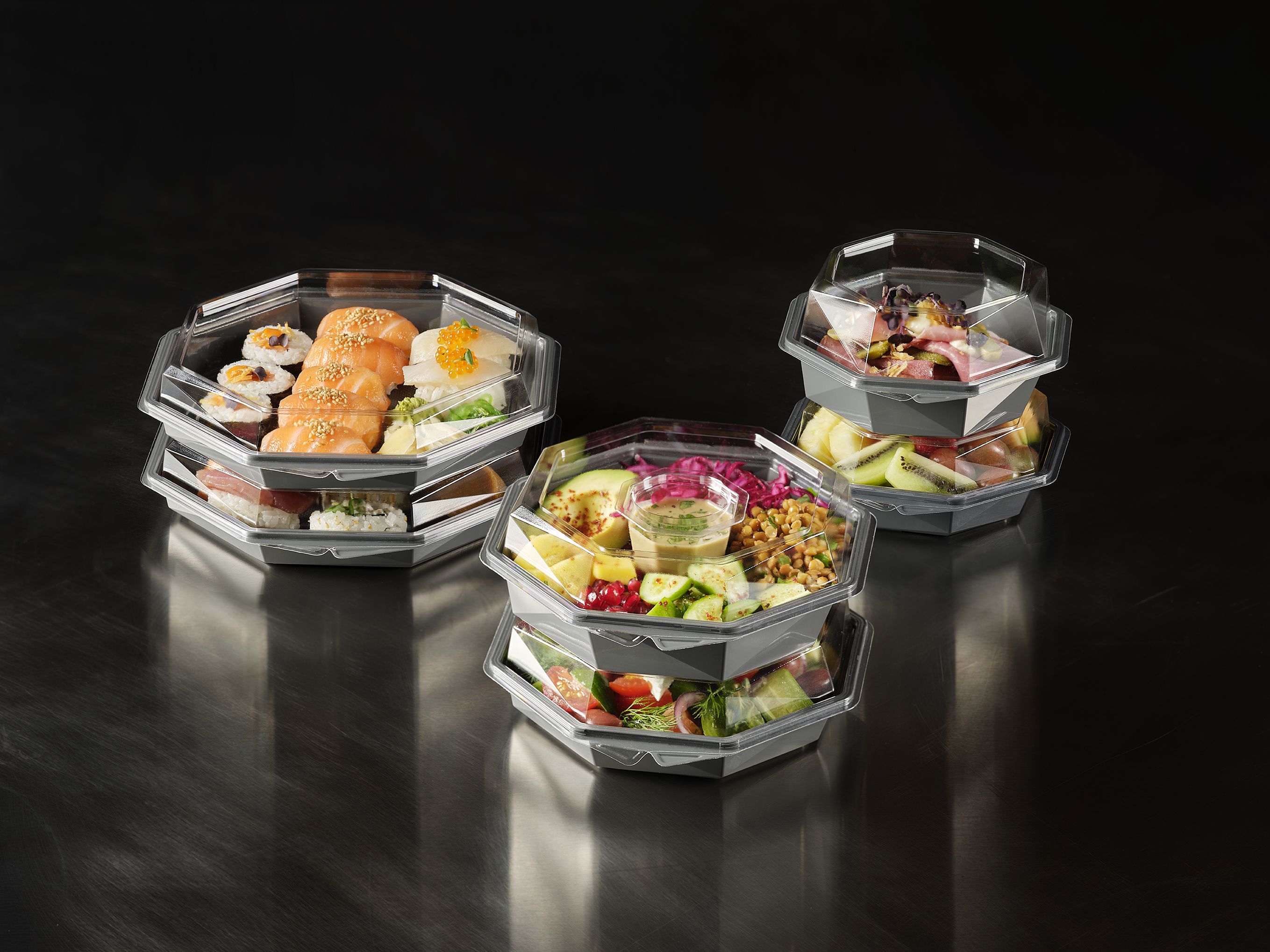 Octaview is Duni Group’s own design, developed based on customer insights and created to meet high standards of both sustainability and functionality – with the aim of putting food at the center. A crystal-clear, anti-fog lid showcases the food from every angle, while the generous plating surface provides space for an elegant presentation. The updated construction simplifies handling in kitchens and stores, while enhancing the visual appeal of the contents. The series is optimized for stackability and secure transport, featuring a leak-proof lid that protects the food.