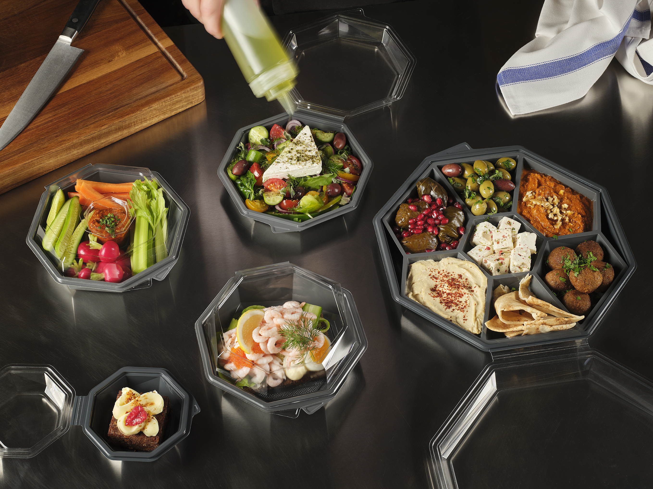 Octaview is Duni Group’s own design, developed based on customer insights and created to meet high standards of both sustainability and functionality – with the aim of putting food at the center. A crystal-clear, anti-fog lid showcases the food from every angle, while the generous plating surface provides space for an elegant presentation. The updated construction simplifies handling in kitchens and stores, while enhancing the visual appeal of the contents. The series is optimized for stackability and secure transport, featuring a leak-proof lid that protects the food.