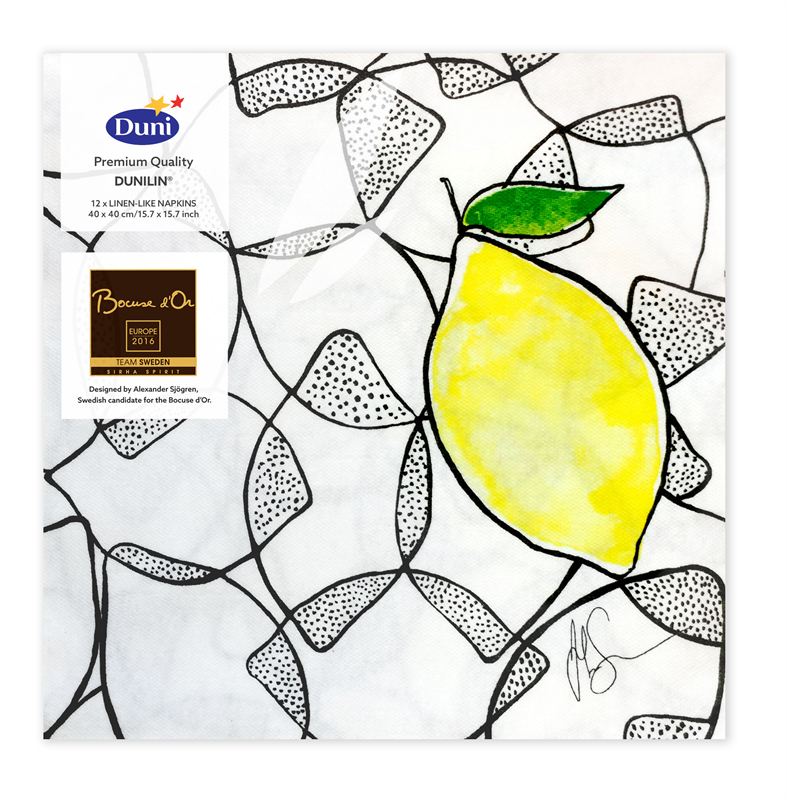 ”Vi är stolta över att Alexander Sjögren tillsammans med oss arbetat fram en ett unikt motiv som vi med glädje sätter på vår servett”, säger Tina Andersson, affärsområdesdirektör Consumer & Corporate Marketing på Duni. ”Servettdesignen symboliserar inte bara Alexanders matlagning, den ger även en subtil vinkning till en av årets stora trendfärger – gult. Den lyfter också fram citronens särskilda form och textur, nästan likt en målning. Vi ser fram emot att lansera servetten i bredare omfattning under 2016.”