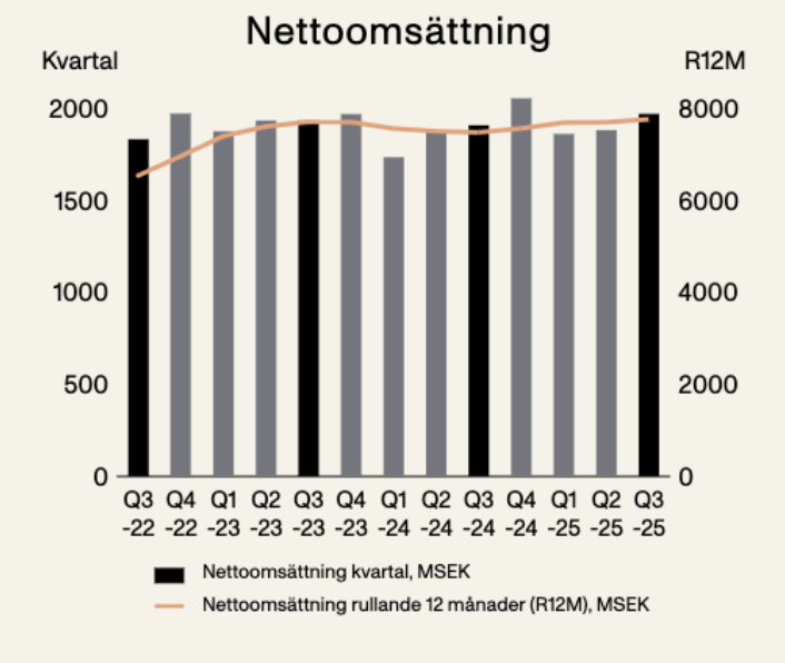 | Nyckeltal MSEK | 3 mån jul-sep 2025 | 3 mån jul-sep 2024 | 9 mån jan-sep 2025 | 9 mån jan-sep 2024 | 12 mån okt-sep 2024/25 | 12 mån jan-dec 2024 |